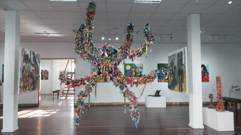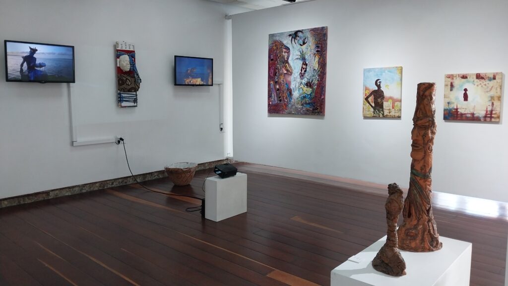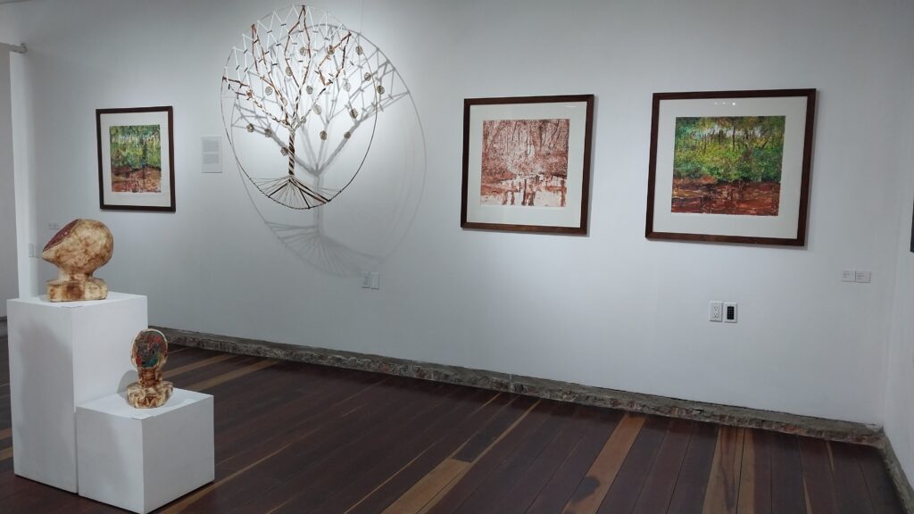 Muddy waters are characteristic of our rivers. We often find the mud dirty and ugly, but it provides fertility and life. The rivers stretch from south to north and form the lifelines of flora and fauna. These waters are also indispensable for people, in our daily life and our economic activities, for example as sources of food and drinking water, as suppliers of fertile soil through the disposal of silt in the coastal plain, and as an important network of connecting waterways in our country. In another sense muddy waters also stand symbolic for the murkiness of what is happening in our rainforest. Failing government policy allows people who put their own financial gain first to go ahead. Instead of sustainable development activities, illegal logging and gold mining are proliferating. The forest is being destroyed without replanting and the discharge of toxic substances clogs the lifelines of our Amazon. The Indigenous and Maroon communities living in the interior are raising their voices. But still they are not being heard. Just as the Amazon Biennale wanted to be a sapukai, a cry that comes from deep within, from the Amazon artists, this exhibition is an outcry to protect our beautiful rainforest.