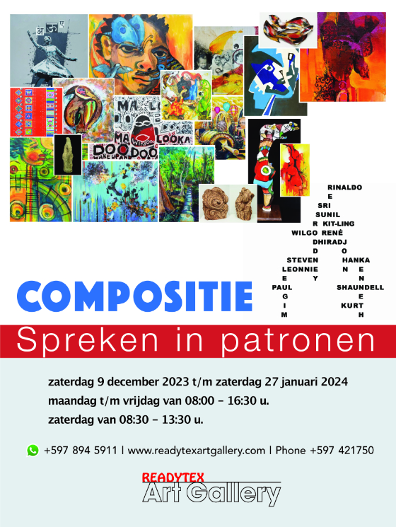 We are excited to invite you to a special group exhibition titled Compositie. Spreken in patronen (Composition. Speaking in patterns). Inspired by alakondre, visual artist Dhiradj Ramsamoedj, the curator of this exhibition, created a unique arrangement to showcase artworks from eighteen artists affiliated to Readytex Art Gallery.