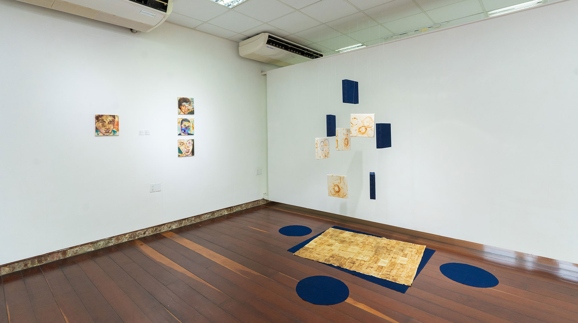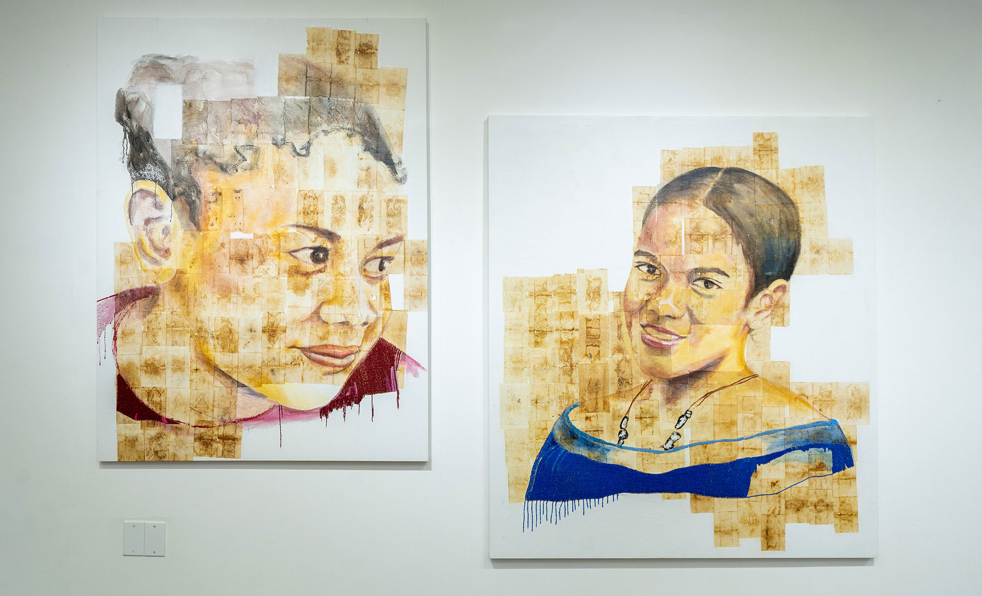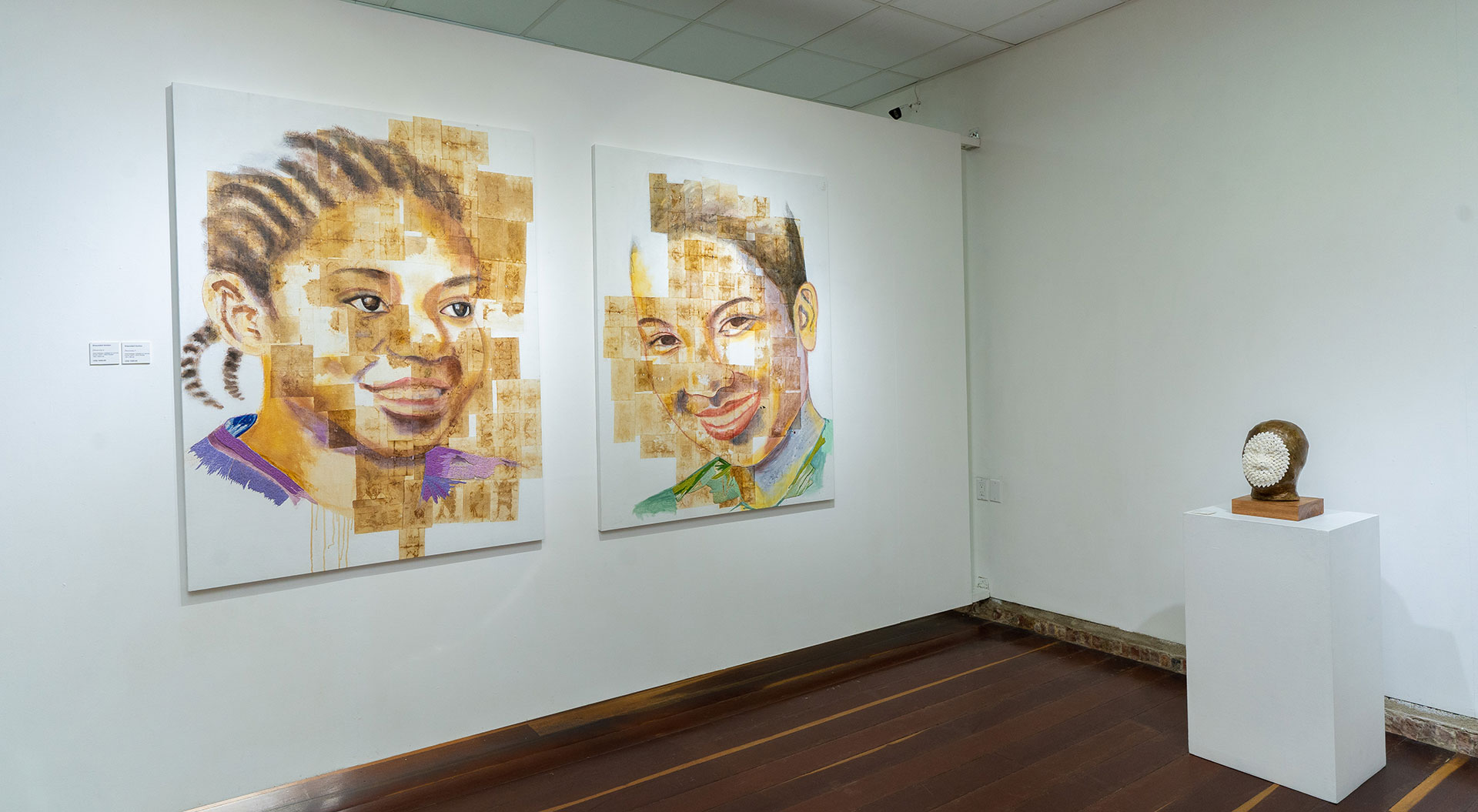 In a series of large portraits, in which she would normally apply used teabags to the entire background in a collage technique, she now purposely leaves a significant amount of empty white space. For Shaundell, this white space symbolizes the space that she allows herself to remain receptive to new impressions and influences. A space that thus gives her the opportunity to enrich, expand and strengthen her art as well as her identity. And looking at the other works in the exhibition, it seems as if Shaundell also wants to create a space for the Threads of Identity of others all over the world, so that they may also openly and respectfully entangle or unite themselves with those of any and all others.