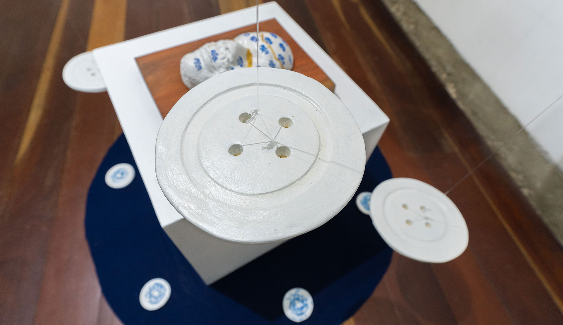 The majority of the new artworks that Shaundell Horton presents in Threads of Identity, reflect her own mixed identity. “Not the identity that people might think to recognize from the outside, but the identity that is formed from within, not only by my origin, but also by everything else I take along from my surroundings and my life experiences.” Because although her country of birth Guyana, plays an important role in her art and in the shaping of her identity, her youth and life in Suriname are also of great influence on everything that she creates. The used teabags, the embroidery and crocheted doilies that she often incorporates in her work, are clear references to the British influences in her heritage. But these literal Threads of Identity are increasingly fused with other visual elements that ultimately form the threads of a much broader narrative. For this exhibition, for example, she makes abstract masks in which she combines ceramics and crocheting. Perhaps the clay that she uses there has something to do with an earthier component, with the soil of the country that she currently considers her home? And the various colors of the threads used to crochet, perhaps with the rich cultural diversity in our beautiful Alakondre Suriname?